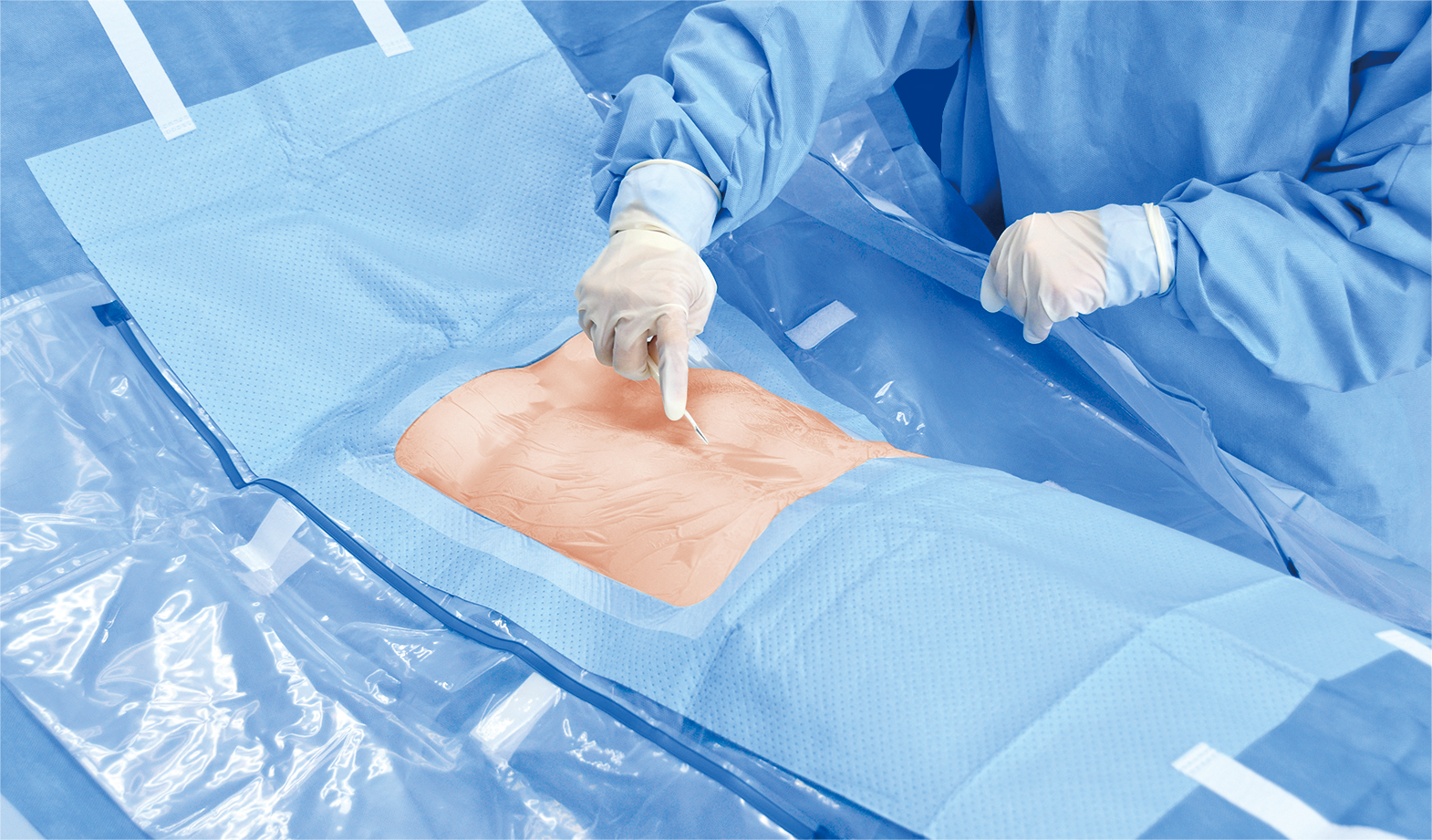 【結構及組成】產品基層、加強片(選配)、醫用手術膜(選配)、軟質膠布(選配)、積液袋(選配)組成,基層由SMS復合無紡布、PE膜制成,加強片由無紡布、PE膜制成,醫用手術膜由聚乙烯膜或聚氨酯膜制成,軟質膠布由TPE制成,積液袋由PE膜制成、鋁條制成。產品經環氧乙烷滅菌,應無菌。
